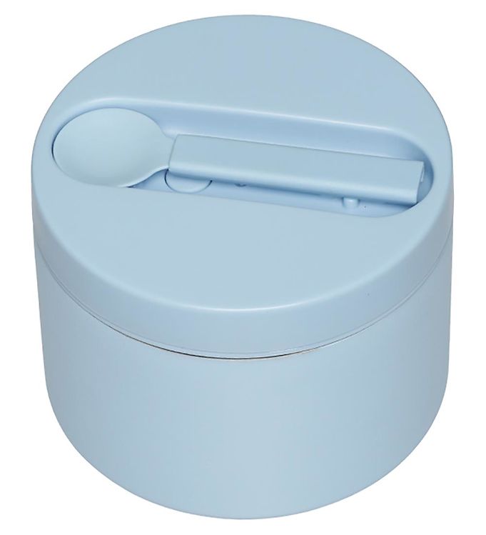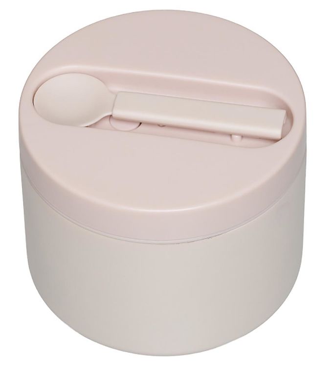 Der medfølger en ske, som kan sættes fast på beholderen i en silikonestrop.